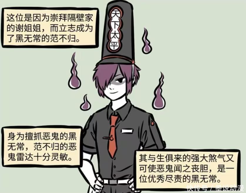 黑无常和白无常一样,都是地府公务员的一个职位。黑无常之中,最具代表性人物的人就是范不归,也就是以范无咎作为原型。范不归从小就崇拜谢安,成为黑无常之后,也跟谢安组队。平时嫉恶如仇,恶鬼在他面前无所遁形,九月还被他抓过。